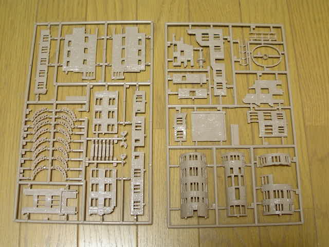 上の写真がキット内容。左からベース、建物、取説、下にあるのはオマケで付属の絵葉書。
